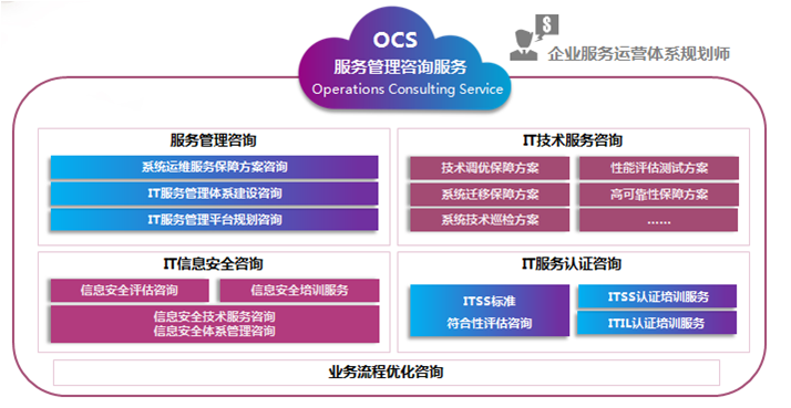 该产品是基于ITIL、ITSS信息服务管理标准框架,为大型企业提供从规划、设计、实施到改进整个IT服务运营管理全生命周期的咨询服务。